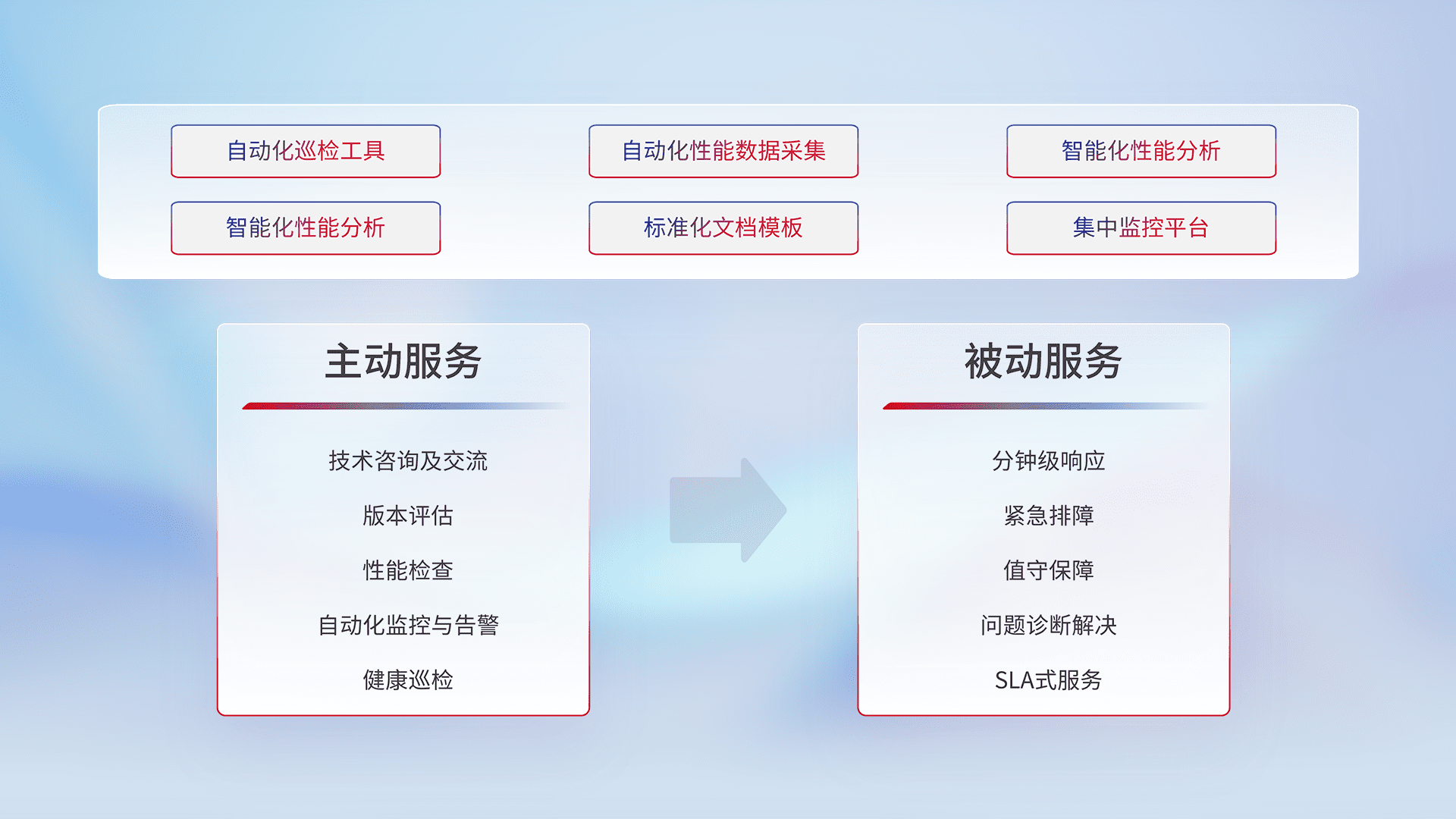 智能化工具和标准化文档,,保障服务质量,,,提供主动服务(包含技术咨询、、版本评估、、性能检查、、自动化监控与告警、、健康巡检)和被动服务包含(分钟级响应、、、紧急排障、、、、值守保障、、、问题诊断解决、、、、SLA服务)。。